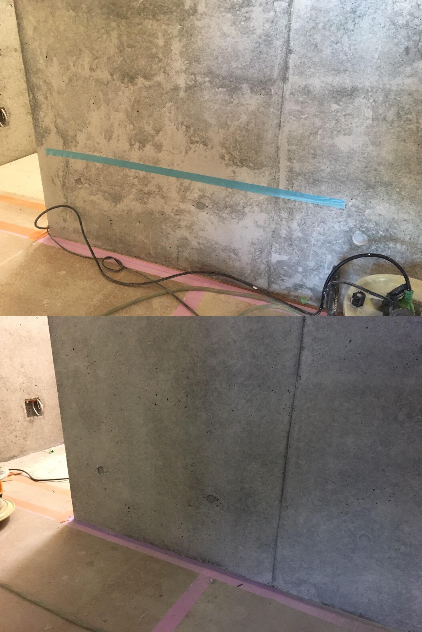 1F部分がRC造、2F部分が木造の建物。内装にも打ち放しが採用されていて、特に「目線の位置」に打ち放しが多くあるためきれいな仕上がりを希望されていたのでとくにきれいに施工しました。内装に骨材露出箇所があると衣服や肌を傷つけてしまうため、内装に採用される方の多くは打ち放し面の平滑さを求められます。写真の箇所は1日1名で約50000円