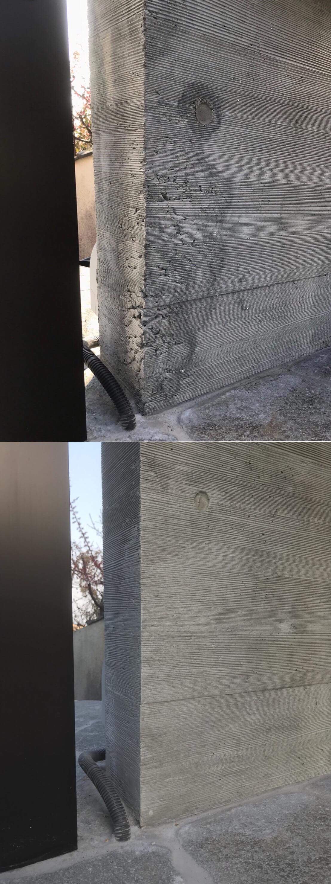 大変驚いていただきました。取引先商社の引合で施工。静岡県。特殊型枠でうづくり杉板正目のような打ち放しで、下部にジャンカが発生したところを補修。細部まで非常に作り込んでいるのでこの箇所だけで15万。