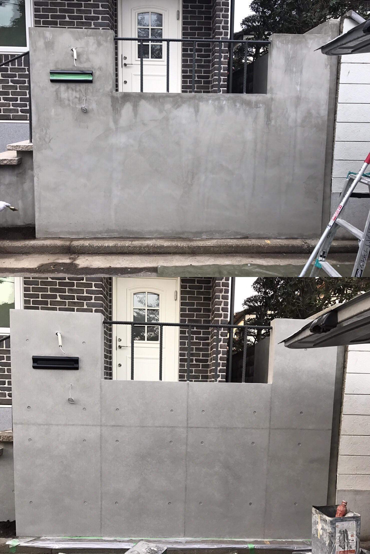 ※Before(上)ブロックを積み上げ左官材で下地を作る、After(下)打ち放し色合わせを施工