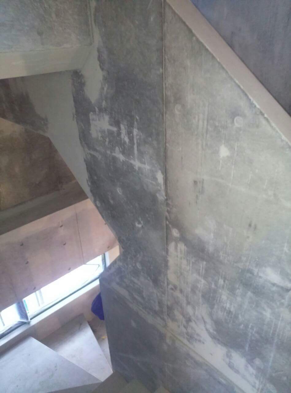新築ビル階段室踊り場での施工。 階段室は壁構造の塊で、本体部分よりも複雑な型枠。そのため打継やジャンカが発生しやすい。また、本体外部壁よりも人の目線が非常に近く、内見や施主検査でも指摘されやすい箇所で特に気を遣う。 施工費用は6F建てのビルで階段室のほとんどに手を入れたため、およそ60万円。お問合せいただいた神奈川県内の建設会社さんから「違和感なく仕上がり助かった」とご評価